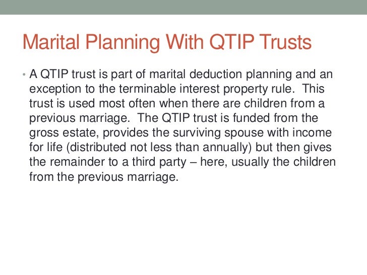 Because these trusts offer tax and other estate planning advantages (such as qualified terminable interest property trust. This trust allows you to provide assets to support your surviving spouse during his or her life, while maintaining the right to ... Retrieve Content